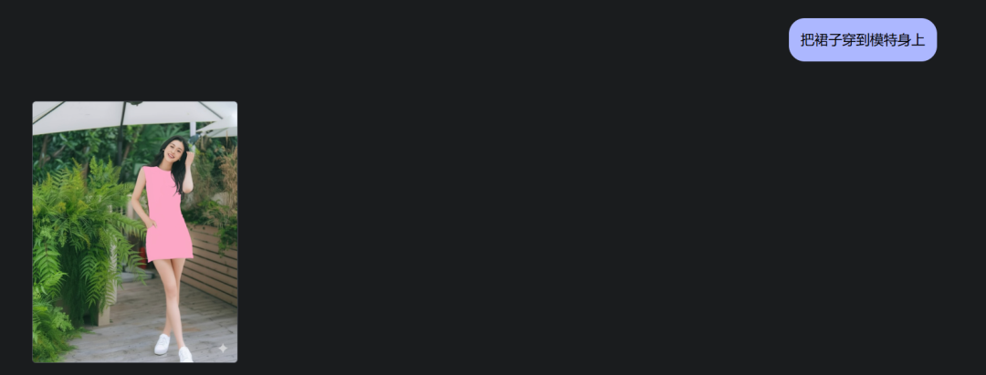为了让效果更生动,我还可以让模特摆出不同的姿势,比如抬起左手或者坐到凳子上。只需一句话,AI 就能完成这些复杂的操作。