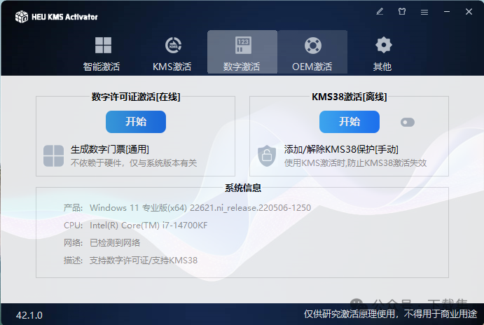 HEU KMS Activator v42.1.0以其强大的功能和便捷的操作,为用户们带来了全新的激活体验。无论是智能激活、数字激活,还是传统的KMS激活和OEM激活,都能满足不同用户的需求。精美的界面设计和对Office 2024的支持,更是让它脱颖而出。如果你在寻找一款高效、稳定的激活工具,不妨试试HEU KMS Activator v42.1.0,它定能为你带来意想不到的惊喜!