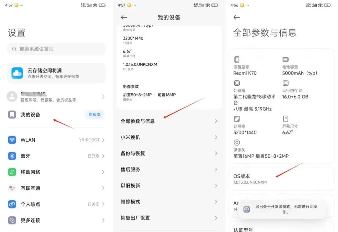 2. 在“我的设备”页面中,多次连续点击“版本号”,直到系统提示已开启开发者选项。