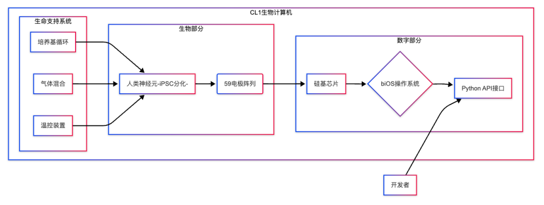 CL1生物计算机是一种“生物-数字混合系统”,它将从干细胞培养出来的人类神经元与传统的硅基芯片相结合。以下是其工作原理的详细介绍: